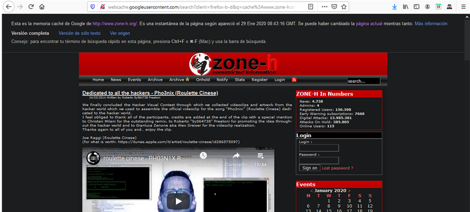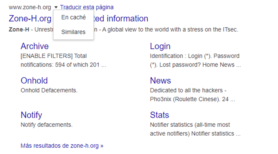 • cache:zone-h.org → visualiza cómo lucía la página al momento de la captura.