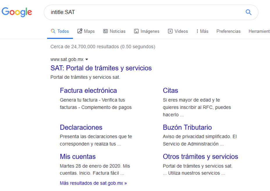intitle:SAT login → mostrará sitios donde “SAT” aparece en el título y pueden tener un portal de acceso.