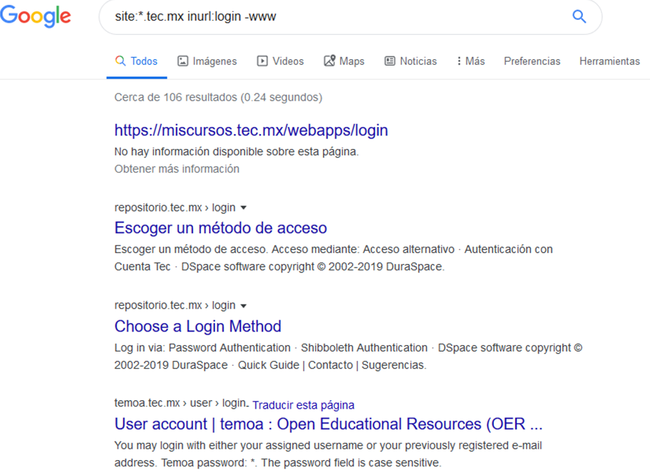 2. En la imagen se realiza una búsqueda de subdominios, usando un wildcard y excluyendo las páginas que empiecen con www, además se busca los subdominios donde existan un login.